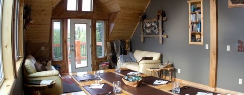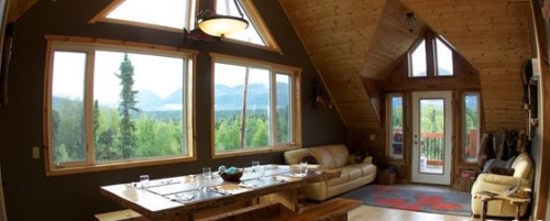 River Wild Lodge Lake Clark Alaska. What ever your Alaska dream might include we will create you a custom adventure trip or fishing vacation. Return to the lodge every evening and enjoy a view of Tanalian Mountain as you dine on deliciously prepared cuisine. Fall asleep dreaming of how tomorrow will be more memorable than the last. Your hosts, Seth and Jeelan Kroenke invite you to dream big and experience an extraordinary adventure in Alaska’s rugged frontier. Alaska’s River Wild Lodge rests on the shores of Lake Clark, within the unspoiled beauty and untamed wilderness of Lake Clark National Park. Port Alsworth is a picturesque Alaskan village that will captivate you with its surrounding beauty. Fly beside glaciers and jagged peaks in Lake Clark Pass and catch a glimpse of wildlife below as you fly to Lake Clark. Let the desire to explore this vast wilderness take control and allow yourself to relax in this small mountain village. You’ll immediately feel like family as Seth and Jeelan welcome you to share their Alaskan paradise. Seth’s enthusiasm for living the Alaskan dream is contagious and you’ll soon be enthralled in a story about angling for trophy rainbow trout while watching grizzly bears down the beach. Discus your days’ adventures over a fresh caught Alaskan salmon and soak up the view of majestic Tanalian Mountain. Be captivated by Alaska’s untouched frontier and relax at night in a lodge truly designed for your comfort. We promise you’ll leave wanting more. Dine and relax in the great room that overlooks majestic Tanalian Mountain and view black bear, brown bear or dall sheep through the scope. Swap stories of the days’ expeditions over dinner and dream about what the next day might bring. With its own entrance, the great room is always open for your relaxation. Read a book, sip a cup of coffee, visit with your hosts and enjoy the exceptional service.