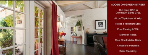 A Bed & Breakfast for People Who Dont Like Bed & Breakfasts. We know the feeling: the hovering innkeeper, the forced conversation at breakfast, the doilies and faded family photos. You wont find any of these at the Adobe. Just simple beauty, quiet, independence, and privacy. Our self-serve breakfast in the morning allows you to decide when to eat and who you want to talk to (or not talk to). Ten Reasons to Stay at the Adobe on Green Street 1. Location. If youre planning a visit to Santa Cruz, make sure to choose lodging that is in town, not far from restaurants, shops and cafes. The Adobe is three blocks from downtown. WalkScore.com rates the Adobe a "Walkers Paradise" with a score of 100 out of 100, the highest rating of any hotel, motel, inn or B&B in Santa Cruz. 2. Quiet Rooms. A persistent problem for small inns and hotels is thin walls. Most walls here are 17 inch thick adobe and our bedrooms dont share a common wall with one another. Its popular these days for hotels to have a mini fridge in the room. Nice idea, but it puts a noisy appliance in your room that hums all night. We have a big kitchen refrigerator that you can use so your room is quiet. 3. Comfort. Up to half of your time spent at the Adobe will be in bed. Thats why every room features hand-made natural latex pillow-top beds. Spend one night in these beds and you wont want to leave. We also use high thread count cotton linens and blankets. We dont sleep on polyester, why should you? 4. Cleanliness. We spend a lot of time at the Adobe working on maintenance and thorough cleaning. We show our respect to you by making sure your room is clean and perfectly prepared. 5. Beauty. Of course, were a little biased, but the Adobe and its setting are beautiful, simple, elegant, clean and tasteful. Surrounded by gardens, the views out every window are lovely. Many of our guests call the Adobe romantic. 6. Privacy & Flexibility. Were not the kind of place where the innkeeper hovers over you and observes your every move. We respect your privacy and allow you to have your independence. This is what we prefer when we travel and we have made it a priority here. 7. Wifi, Parking & Plugs. We have a free wifi and off-street parking. Places to plug things in is a pet peeve of ours when we travel. Most hotels are stingy with their electric outlets. Where are we supposed to plug in our phone, camera, iPod, iPad? At the Adobe we guarantee six accessible easy to reach plugs in each room. 8. Sustainability. We are all learning to use resources more wisely. Eighty percent of our electricity is generated with solar panels on our roof. Our solar system avoids 6 tons of carbon dioxide in the air each year. We also use those panels to power our electric vehicle charging station. We make our own natural cleaning solution and use it throughout the inn. 9. No Minimum Stay. Come for one night if you wish. There is never a minimum stay at the Adobe ever. Even during holidays. 10. Published Rates and Good Value. Its popular now to quote rates only after you have input the dates of your stay. Inn rates often fluxuate with demand. Our rates are published right on our rooms page and are generally 10-20% below other quality inns in Santa Cruz.