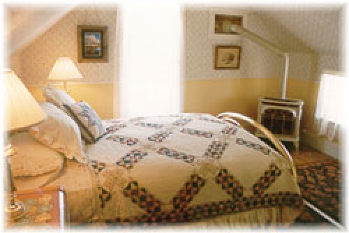 Gracious portrays the Beardsley Room, with its scrolled iron queen size bed, see-thru stove, main floor garden patio, whirlpool tub & separate spacious shower.