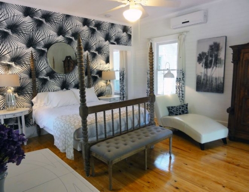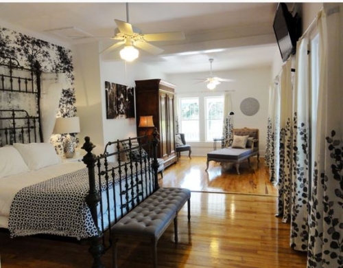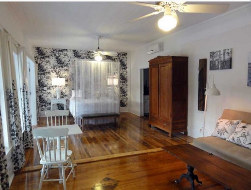 Bald Cypress features both a sleeping area with an artist-made wrought iron Fleur de Lis queen canopy bed and a sitting area with a click clack sofa that converts to a double bed, two comfy chairs and a 19th Century French armoire. The highlight of the room is the 10-foot tall cypress knee (dredged from an Alabama river) that has been turned into a torchiere and the old photos from 1950s Cypress Gardens.