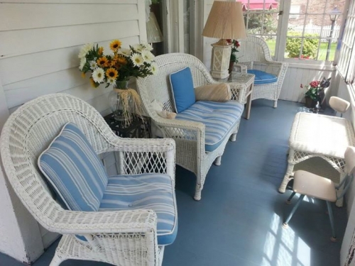 A separate guest entrance leads one onto the furnished, enclosed wrap around porch before entering the main hall with a cozy library tucked away on one end supported by a wide selection of reading materials and CD's.