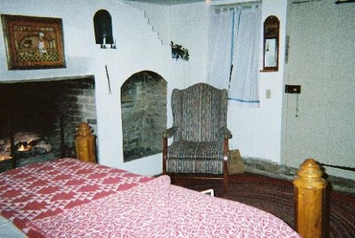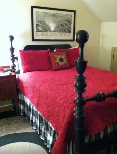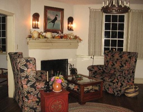 Electrified beeswax window candles warmly welcome guests. Inside, a corner fireplace, characteristic of Moravian architecture, graces the parlor where in winter, a wood fire burns. Throughout the year, the parlor is a gathering place for guests; its comfortable surroundings encouraging conversation and kindling new friendships. A formal dining room, off the parlor, also has a corner, wood-burning fireplace. It can be used by guests who prefer this setting to the parlor. The rear wall has a historically accurate mural that presents a view of Old Salem in 1844 from this perspective; several buildings in the mural exist today.